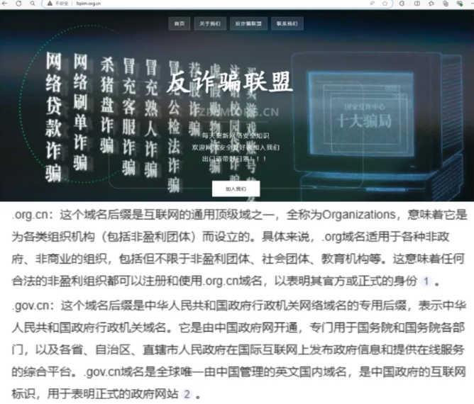 首先,除了账号的认证为黄V认证外,冠以“中国”名号的反诈骗联盟的官网,所用域名后缀为企业使用的“.org.cn”,而非政府机构使用的“.gov.cn”——如果“中国反诈骗联盟”是官方机构,为何不直接使用政府机构域名后缀?