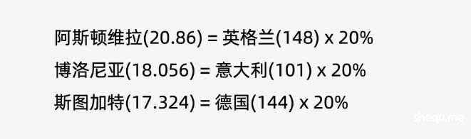 实际上,在赫罗纳和布雷斯特之外,近5个赛季欧战参赛次数较少的阿斯顿维拉、博洛尼亚和斯图加特也以英格兰、意大利和德国的协会系数的20%作为俱乐部系数,分别是20.86(148*0.2)、18.056(101*0.2)和17.324(144*0.2)。