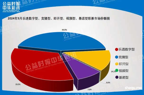 分类型来看,5月份,乐透数字型彩票销售157.05亿元,同比减少2.98亿元,下降1.9%;竞猜型彩票销售213.94亿元,同比增加0.77亿元,增长0.4%;即开型彩票销售67.59亿元,同比减少30.24亿元,下降30.9%;基诺型彩票销售37.59亿元,同比增加8.43亿元,增长28.9%。5月份,乐透数字型、竞猜型、即开型、基诺型彩票销售量分别占彩票销售总量的33.0%、44.9%、14.2%、7.9%。视频型彩票销售0.0012亿元,同比减少0.0012亿元。