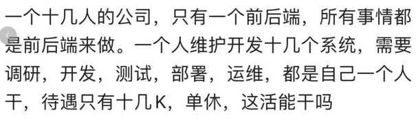 再比如,还有一个码农表示,一个人维护开发十几个系统,需要把调研、开发、测试、部署、运维的都都干了‍‍‍‍