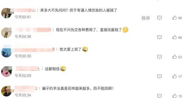 比如有网友表示:「来多大不先问问?终于有通人情世故的人被搞了」「现在不兴先交各种费用了,直接改赢钱了」「骗子的手法真是花样越来越多。防不胜防啊!」