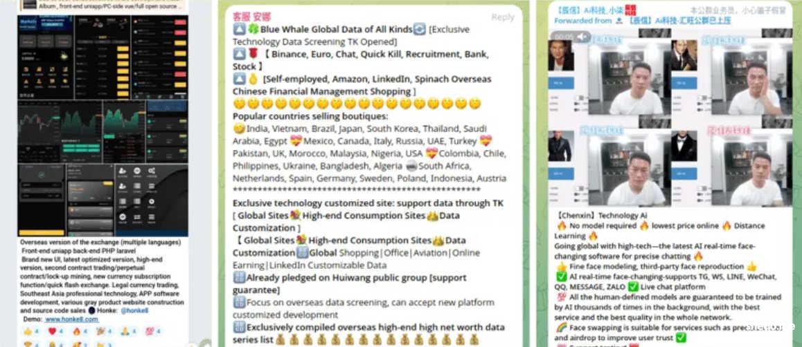 另一类商家提供软件和网站开发服务。这些服务包括创建用于“猪盘”骗局的加密投资网站,旨在诱使受害者存入加密货币,然后将其盗走。还有一些商家出售个人数据,包括联系方式、电信设备和“AI变脸”软件,这些工具被骗子用来瞄准和与受害者进行沟通。