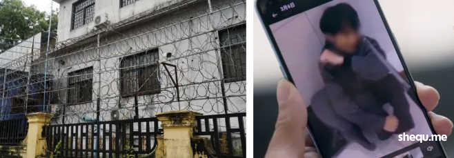 (左图) 柬埔寨西哈努克市的一处诈骗基地,执法人员在此发现了人口贩卖、绑架和酷刑的证据(来源)。(右图) 一名诈骗基地的工人被电棍殴打(来源)