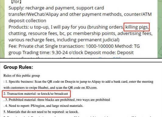 (上图)一名汇旺担保商家提供清洗诈骗所得资金,包括“猪盘”骗局的收益。(下图)另一名商家专门清洗性敲诈骗局(“se敲” - 这里翻译为“性敲诈”)的资金。