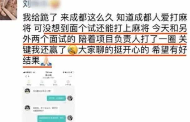 刘女士表示:「来成都这么久,知道成都人爱打麻将,但是没想到面个试还能打上麻将,面试时和另外两个面试的,陪着项目负责人打了一圈麻将……」