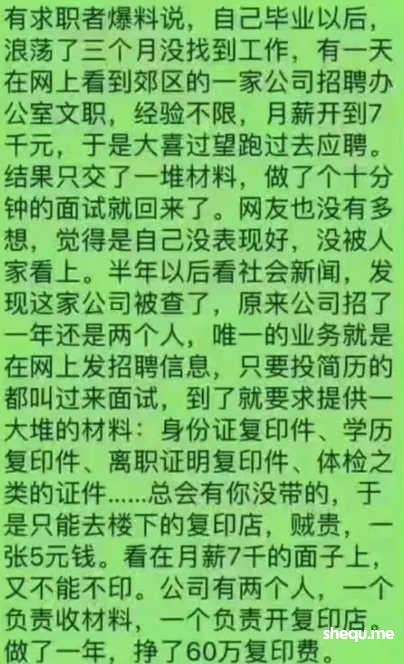 此外,看完面试斗地主被骗一万五这事,也让想起了另外一个炸裂的招聘骗局——打着招聘旗号,给打印店招揽生意。